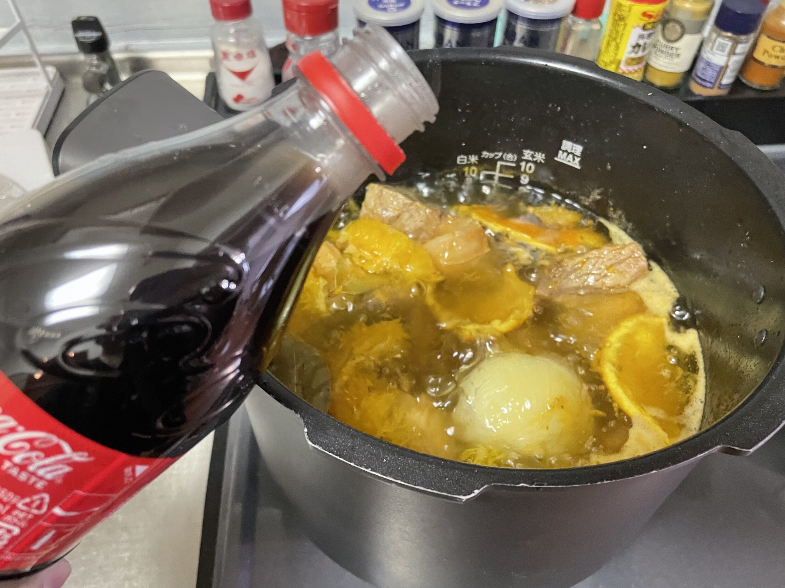さて、ソースを作り終わったあたりで40分ほど経ったので、お鍋にオレンジジュース、オレンジ、ライム果汁、ハーブを加えていきます。そのまま20分ほど煮たら、コーラをいれてあとは2時間じっくりコトコト!